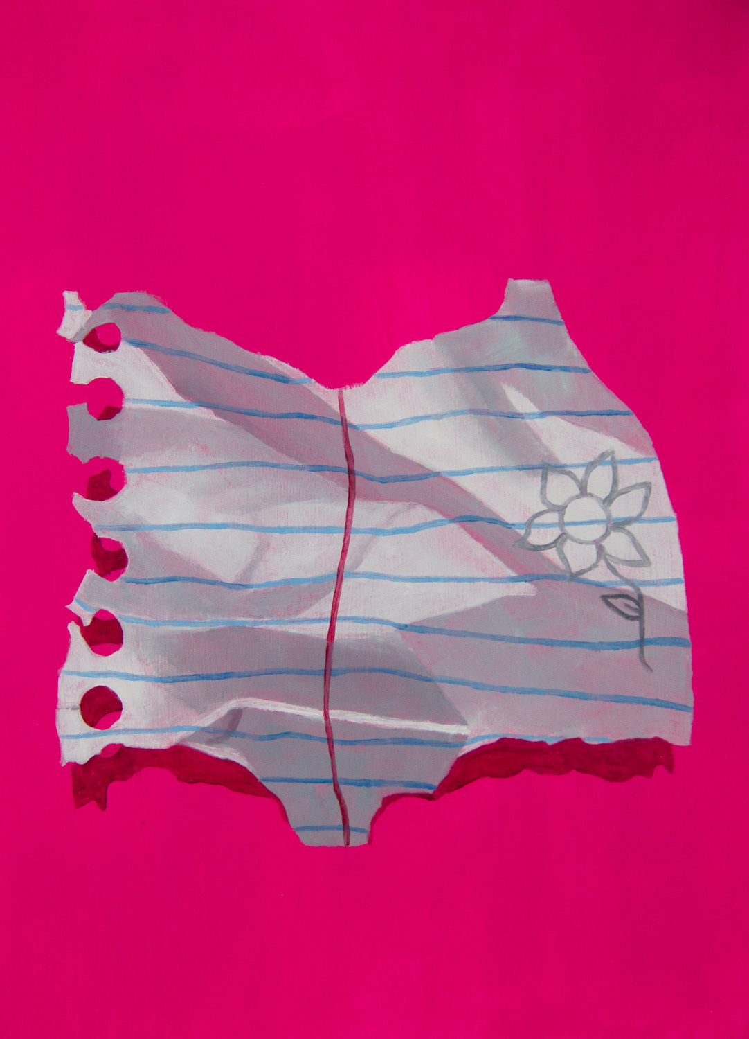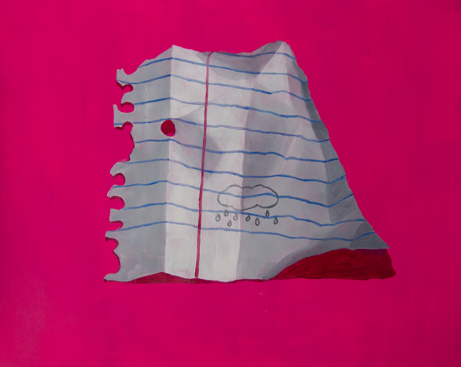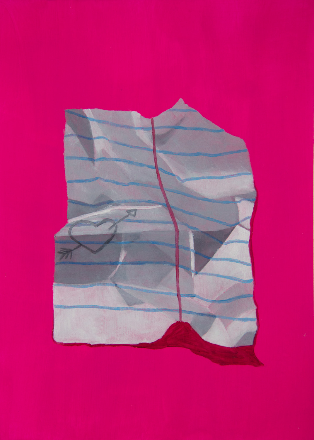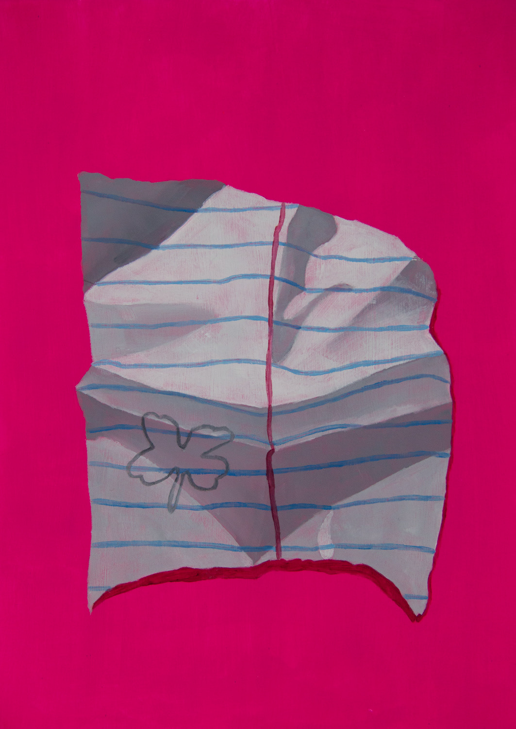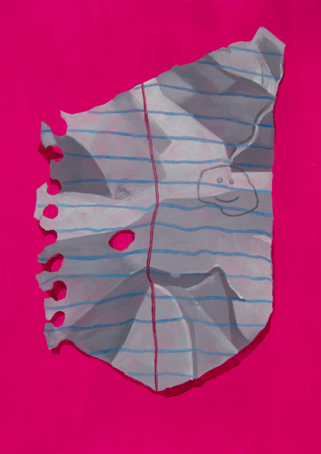 My body of work, The Notes, consists of observational oil paintings of ripped-up pieces of notebook paper. I bend and manipulate the notebook paper in a way that looks interesting, and then shine a light above it to create the shadows. Painting from life is a process I have found to enjoy. Details are easier to capture when the object is directly in front of me. To make the pieces more exciting, I paint a bright pink background inspired by the Pop Art movement of the 50s and 60s. Each painting is completed with a doodle or a saying on the note to bring it to life.